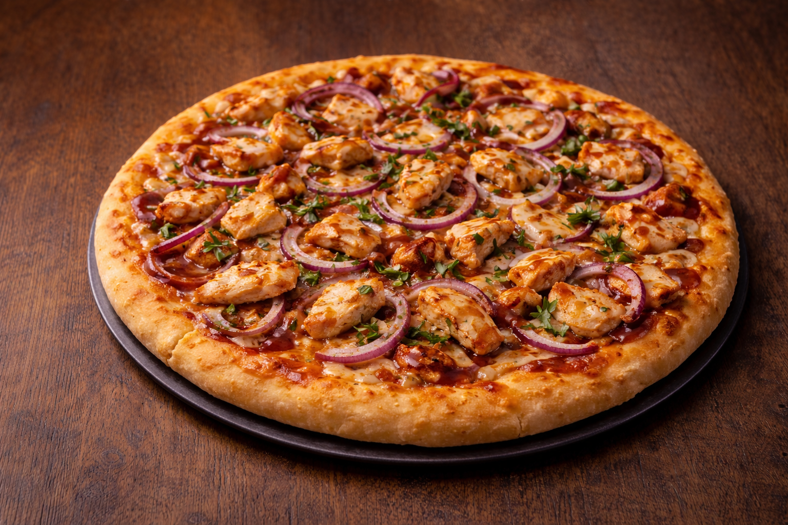 Grilled chicken, BBQ sauce, red onions, mozzarella, and parsley.